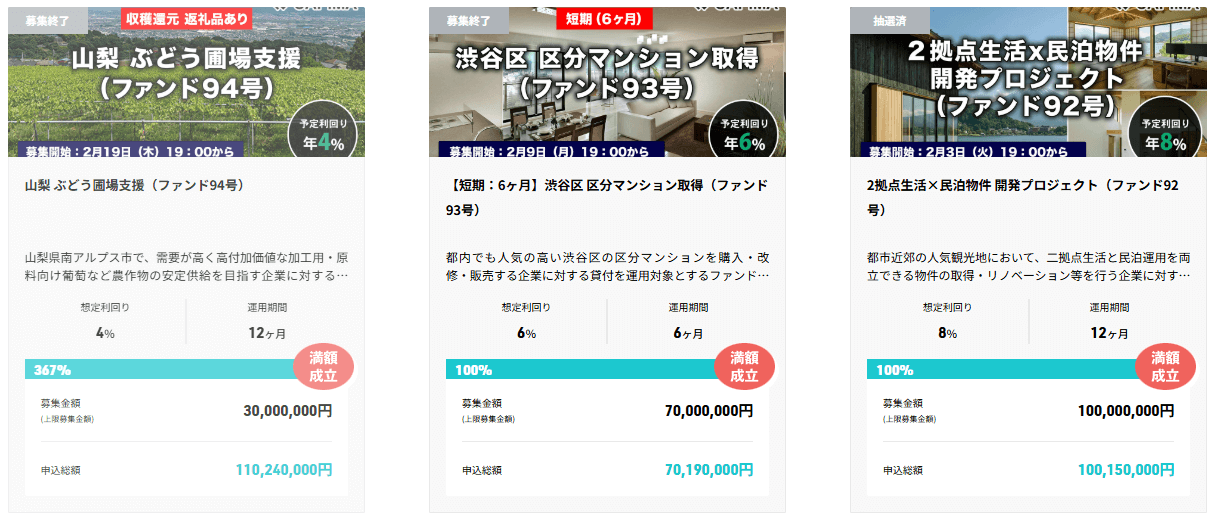 CAPIMAは比較的高利回り帯を狙える案件が多く、短中期運用に向いている点が特徴です。