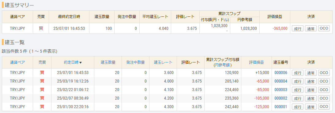 GMOクリック証券で建玉上限の100万通貨まで保有しているので、3.5以下になったら次はみんなのFX(LIGHTペア)で購入する予定です。