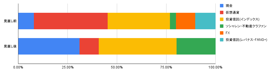 仮想通貨の比率が高すぎるため、資産全体の10%程度まで下げるべき