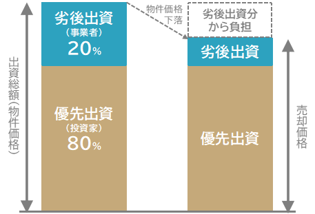 例えば劣後出資が20%、優先出資が80%だった場合、不動産の下落率が20%以内であれば投資家の利益には影響がでないことになります。