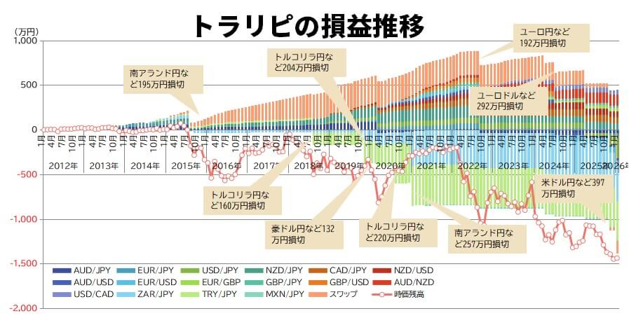 私(為替コヤジ)は2012年1月からトラリピを運用していますが、これまでに100万円以上の大規模ロスカットを9回経験し、累計損失額は1,726万円に上ります。