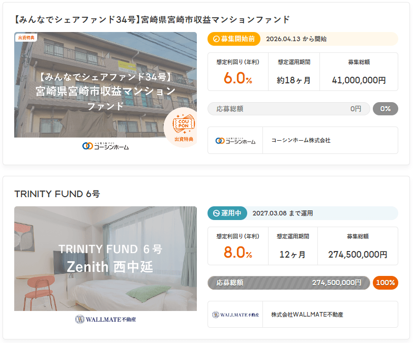 取り扱いファンド数がまだ多くない点もデメリットです。2024年8月のリニューアルオープンから間もなく、COZUCHIやCREALのような大手と比較するとファンド組成実績の蓄積には差があります。今後の拡充が期待されますが、現時点では投資機会が限られる場面もあるでしょう。