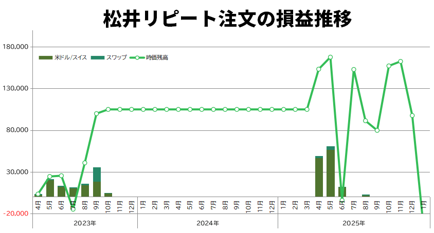 その後、2025年4月に米ドル/スイスフランが過去最安値を更新したので運用資金100万円で運用を再開しました。
