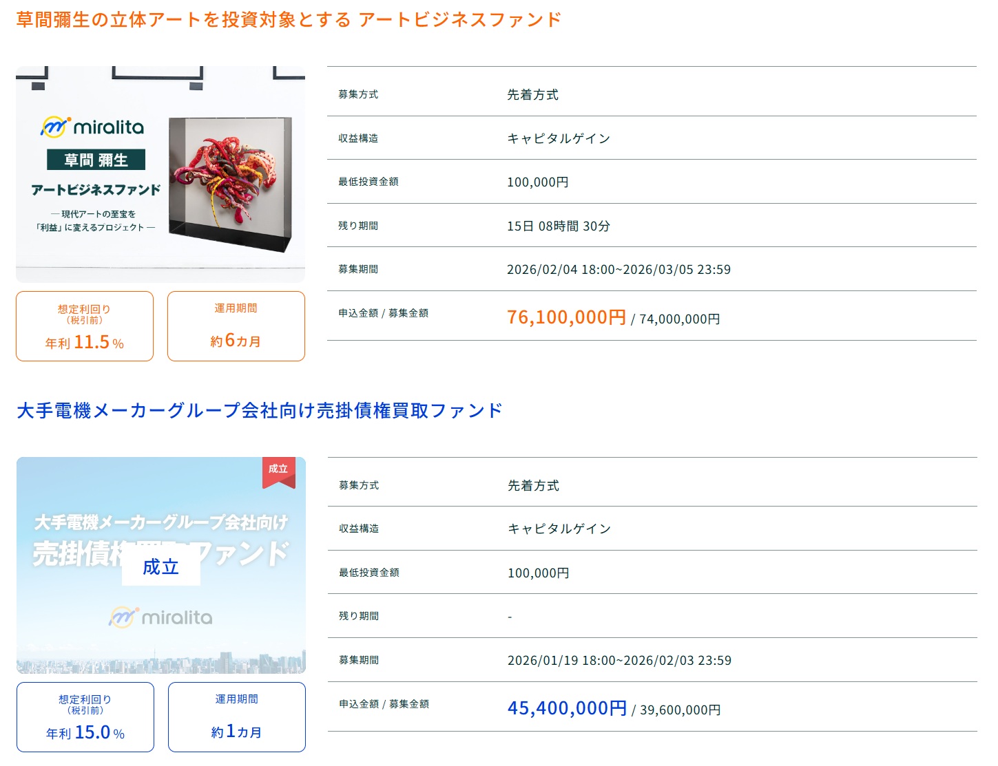 ミラリタは、ファンドによって不動産だけでなく、事業系ファンド(例:短期ファクタリング利用型など)も取り扱っています。