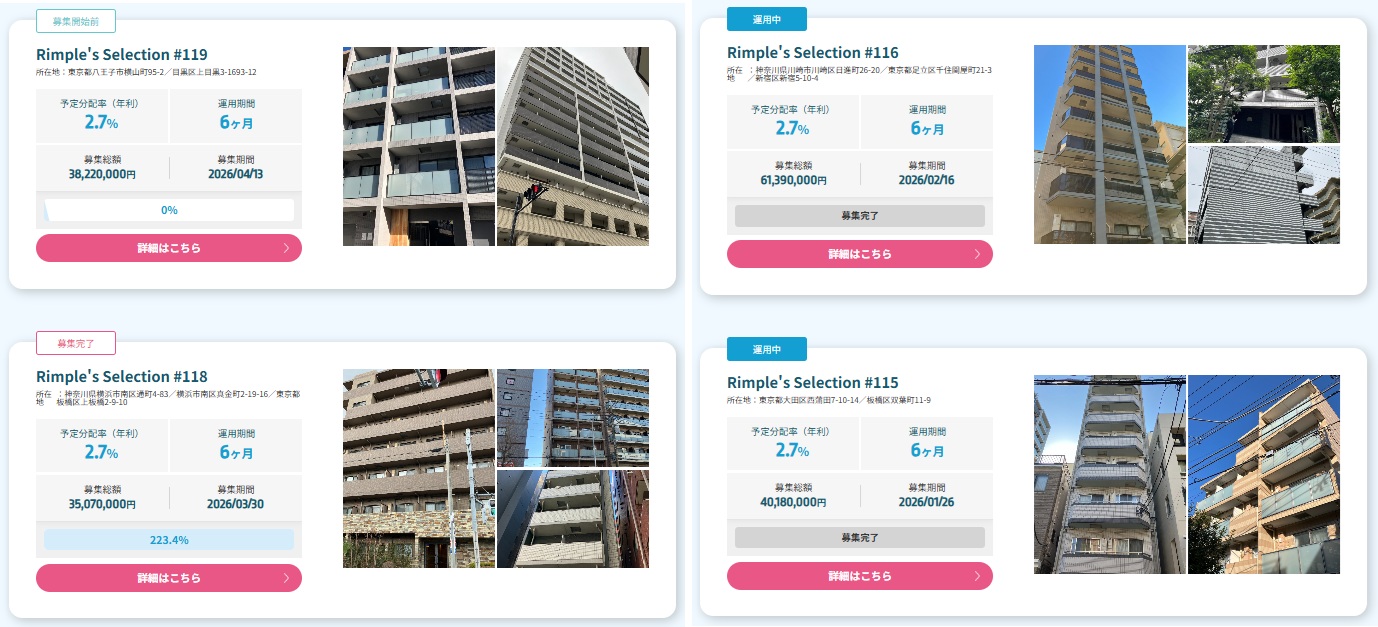 一般的なサービスの劣後出資比率は5〜20%程度ですが、Rimpleはすべてのファンドで固定30%という水準を維持しています。つまり、物件価値が30%以上下落しない限り、投資家の元本には影響が及ばない計算になります。この数字は業界平均を大きく上回る、投資家保護への強い意思表示です。